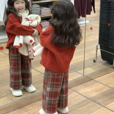 - [빠른수입] 레드니트도톰체크바지셋